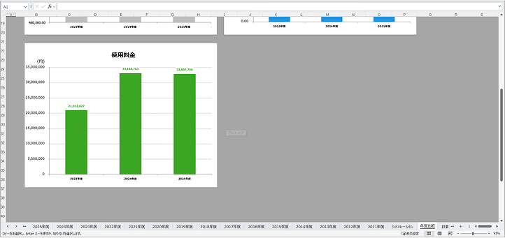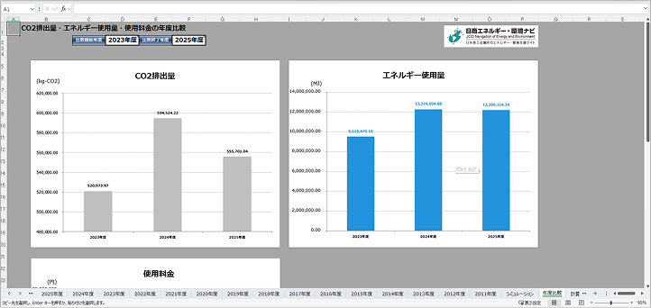 比較する対象範囲の年度を選択することで、対象年度の「CO2排出量」、「エネルギー使用量」、「使用料金」の推移を確認することが可能です。