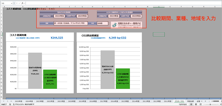 比較期間、業種、地域を入力することで、LED導入によるコストおよびCO2排出量の削減効果をシミュレーションすることが可能です。