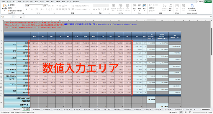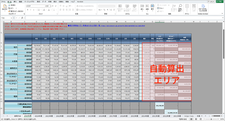 使用量と使用料金を入力後、CO2排出量の合計値などが自動で算出されます。