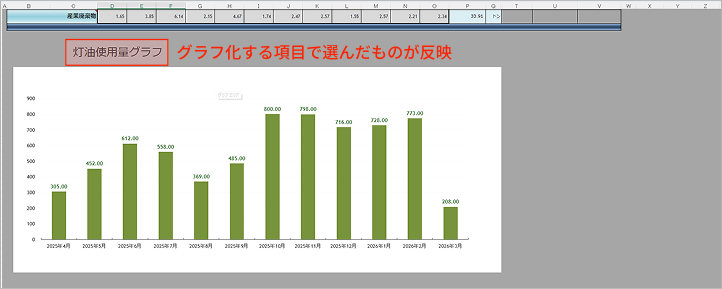 手順1で選択した「グラフ化する項目」の項目が自動でグラフ化されます。 グラフは月ごとの推移で表示されます。